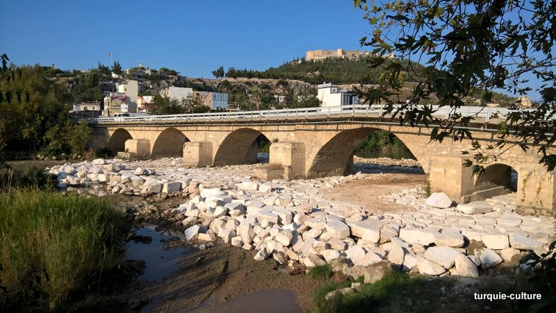 Le dépôt de blocs de pierre au pied des piles du pont en septembre 2018 vise à éviter leur érosion par les flots violents du Göksu.