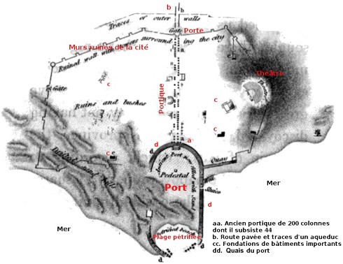 En face de l'entrée du port, un portique se dresse aux environs du quai et s'ouvre en une double rangée de deux cents colonnes, qui, traversant la ville, communique avec la porte principale qui donne sur le pays, et du côté extérieur de cette porte, une route pavée continue vers un pont au-dessus d'une petite rivière. Cette colonnade était probablement aménagée de manière à créer une rue couverte qui, avec l'avenue, le portique et le port, doit avoir jadis formé un beau spectacle : même dans son état actuel de ruine, l'effet de l'ensemble était si imposant que le marin le plus analphabète sur le navire ne pouvait le contempler sans émotion. Les colonnes, cependant, prises isolément, ne semblent pas cet avantage, la pierre dont elles sont composés est trop grossière pour permettre beaucoup de raffinement dans le travail, et le goût de l'architecte semble avoir été aussi incertain que l'exécution. Certaines sont de style corinthien, d'autres sont de style composite ; même leurs proportions varient, la conception du feuillage diffère dans les chapiteaux d'un même ordre, et entre les volutes de certains, sont placés des bustes d'homme, ou des figures d'animaux et d'autres ornements factices. Les supports portent de courtes inscriptions et ont peut-être soutenu des petites statues, [...] mais la corrosion de la pierre a rendu leur lecture impossible. Parmi les deux cents colonnes, pas plus de quarante-quatre sont encore debout, les autres se trouvent à l'endroit où elles sont tombées, mêlées à un vaste ensemble d'autres bâtiments en ruine, qui étaient reliés à la colonnade, et dont les fondations peuvent être faciles à suivre, avec leurs portes et arcades séparées.